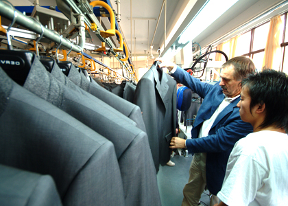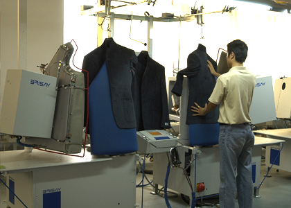 運用高品質(zhì)的德國BRISAY立模整燙機(jī),采用電腦控制蒸汽輸出量、溫度、壓力、定型、抽濕時間,根據(jù)面料的厚薄、質(zhì)地、性能,以38種不同整燙程序調(diào)整以上各個參數(shù),配合服裝的整燙。